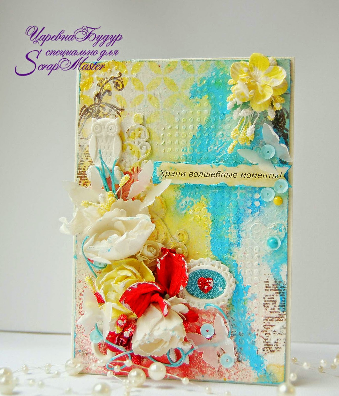 А вот открытки с различными приемами в других цветах палитры: первая - с самодельным фоном, созданным с помощью краски и текстурной пасты, в качестве композиции использованы цветы. Красного совсем немного, не более 10%, основной тон открытке задали синий и желтый цвета.