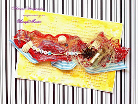 Во второй открытке, которую сделала Анастасия Городилова, так же использован самодельный фон, марля выкрашена в красный цвет, и он становится основной линией сюжета и композиции. Далее открытка разбавлена интересными деталями, в том числе бутылочкой с настоящим письмом, настоящими ракушками нейтральных оттенков, лентой в голубую полоску и другими штучками.